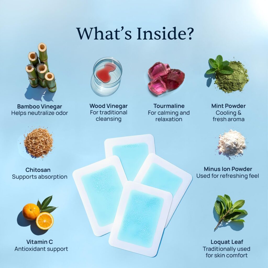 Xitox Foot Pads use a blend of natural ingredients like bamboo vinegar, tourmaline, and wood vinegar.